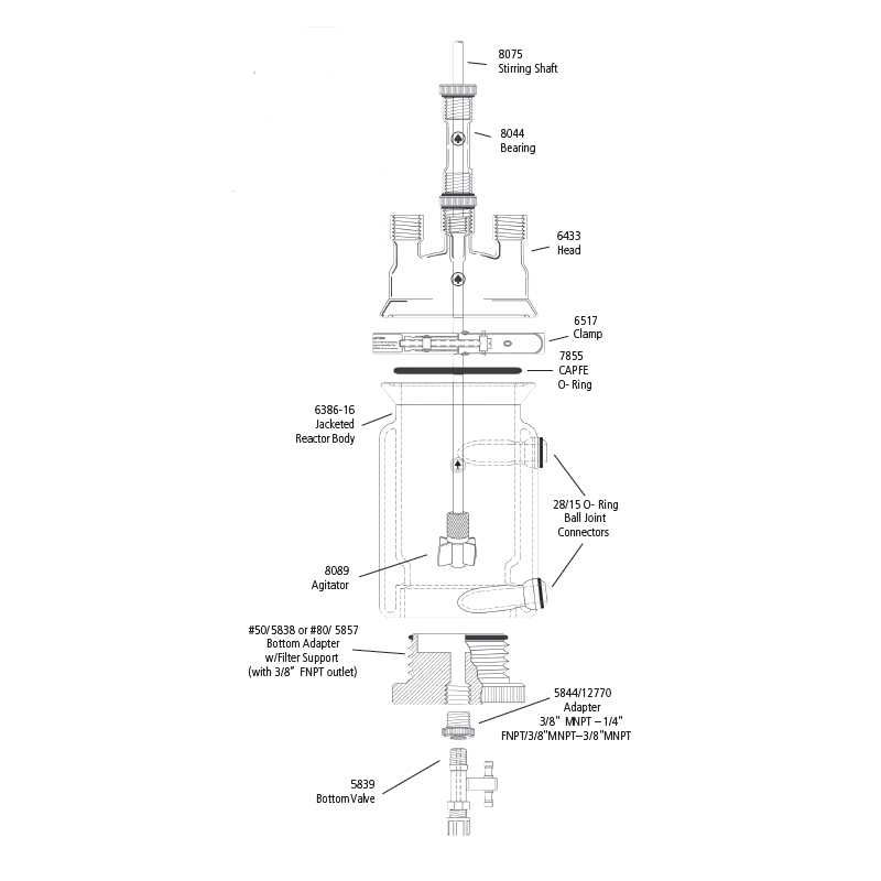 注意:完整項(xiàng)包括:帶60mm CAP O形圈的反應(yīng)釜釜體,帶Acme螺紋的釜蓋,6517夾具,PTFE底部螺紋適配器和帶CAPFE O形圈的閥門(mén),固定環(huán),350μm聚丙烯篩網(wǎng)支架,100μm聚乙烯支架,5844適配器,8044軸承,8075攪拌棒,8089多槳攪拌器,6024冷凝器,7299加料漏斗和#7 A螺紋套管。#80底部適配器還帶有帶孔的玻璃板支架。壓力歧管,支架和夾具是可選的。
