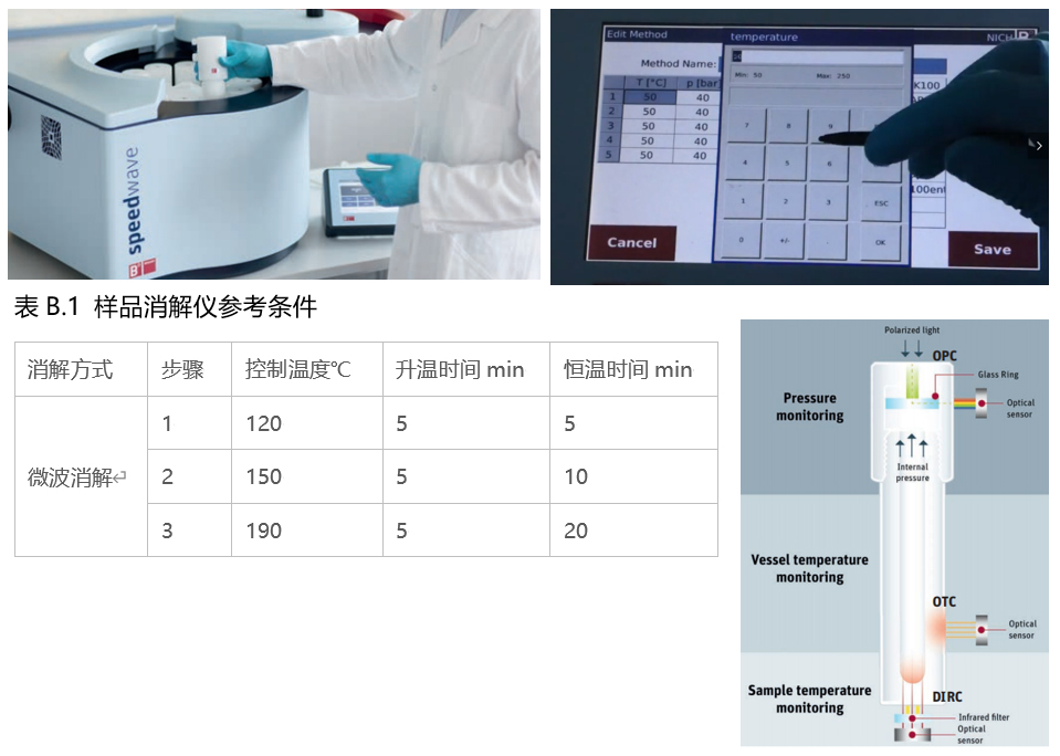 將消解罐放入BERGHOF XPERT微波消解儀中,設定程序,在壹定溫度壓力條件下進行微波消解,具體參數(shù)可持續(xù)優(yōu)化(如下附GB 5009.268-2016 的參考條件)。整個消解過程中,BERGHOF的OTC,OPC,DIRC技術監(jiān)控樣品,罐體溫度和罐內壓力,確保實驗的安/全和**。