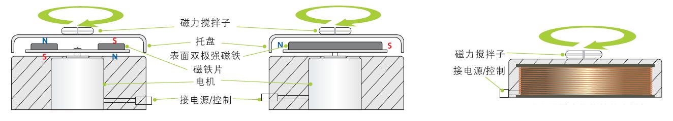 左邊為傳統(tǒng)磁力攪拌,右邊為磁感應(yīng)式磁驅(qū)攪拌,可以從構(gòu)造圖中清晰看到,磁感應(yīng)線圈磁驅(qū)攪拌器已經(jīng)沒有電機(jī)結(jié)構(gòu)了。